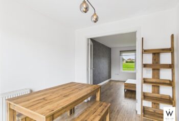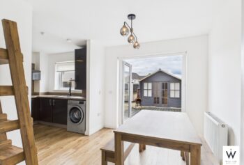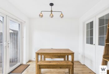 The house features a modern, fully fitted kitchen with appliances, including a dedicated dining area where French doors open out to the enclosed rear garden. A bright and comfortable living area adds to the home’s welcoming atmosphere.