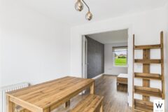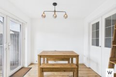 The house features a modern, fully fitted kitchen with appliances, including a dedicated dining area where French doors open out to the enclosed rear garden. A bright and comfortable living area adds to the home’s welcoming atmosphere.