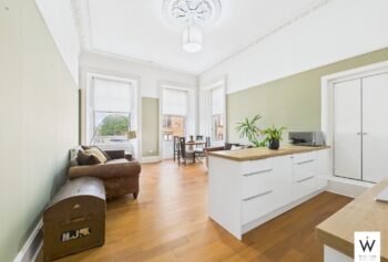 Ideally situated on the first floor, with an immaculately maintained communal stairway, the subject flat is tastefully decorated and generously proportioned with natural light flooding the property. Upon entering, there is an impressive and welcoming hallway with beautiful wooden flooring that flows seamlessly into the open-plan kitchen/living space, creating a warm and elegant feel throughout. From here, the property also offers two sizable double bedrooms and a spacious bathroom.
