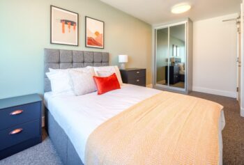 Higher floor room with views over Glasgow, small double bed, desk & chair, wardrobe with full length mirror and chest of drawers. Rooms on floors 7 – 10